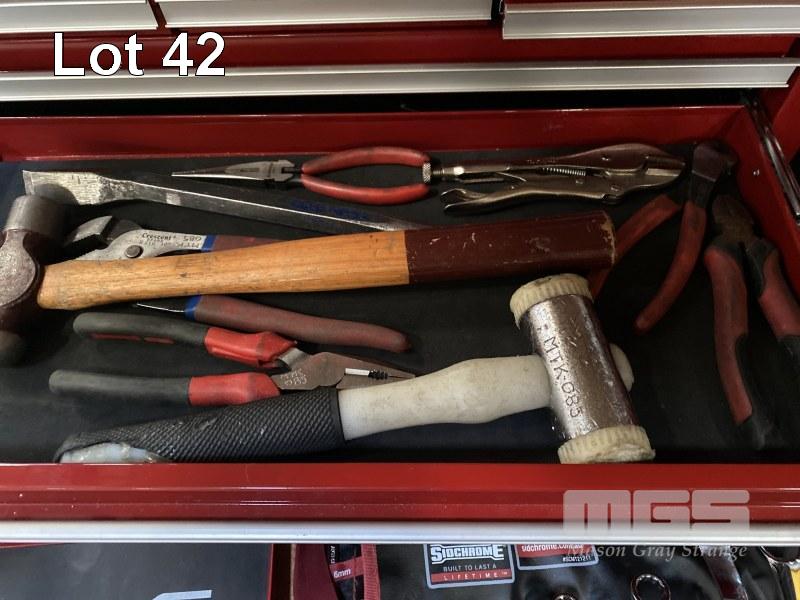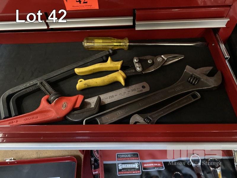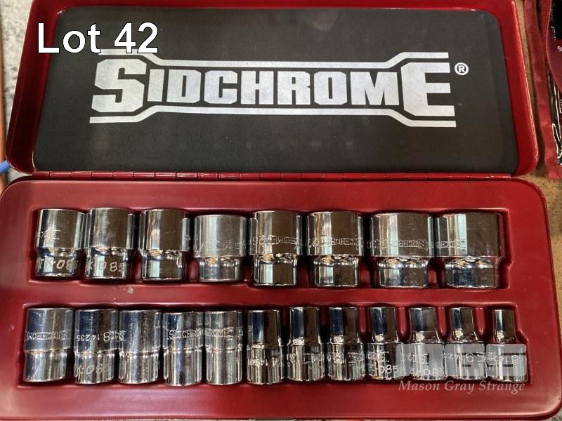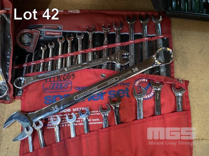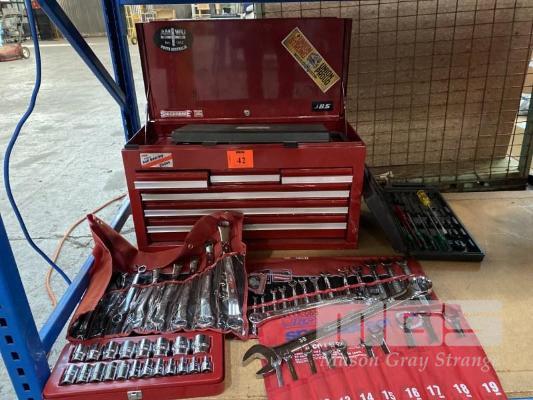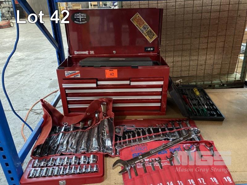 6 DRAWER TOOL BOX COMPRISING: SIDCHROME 1/2 INCH SOCKET SET, 8 - 32mm, SIDCHROME SPANNER SET, 6 - 19mm, SIDCHROME RING SPANNER SET, 6 - 32mm JBS RATCHET SPANNER SET 10 - 19mm PLUS SHIFTERS, TIN SNIPS, PUNCH SET, 36mm SIDCHROME SPANNER, VISE GRIPS, SIDE CUTTERS, SCREW DRIVERS ETC.