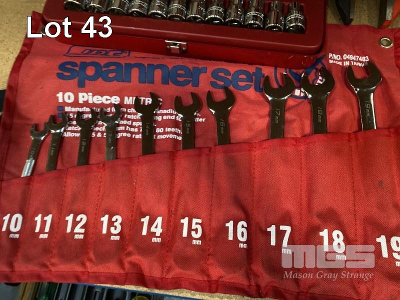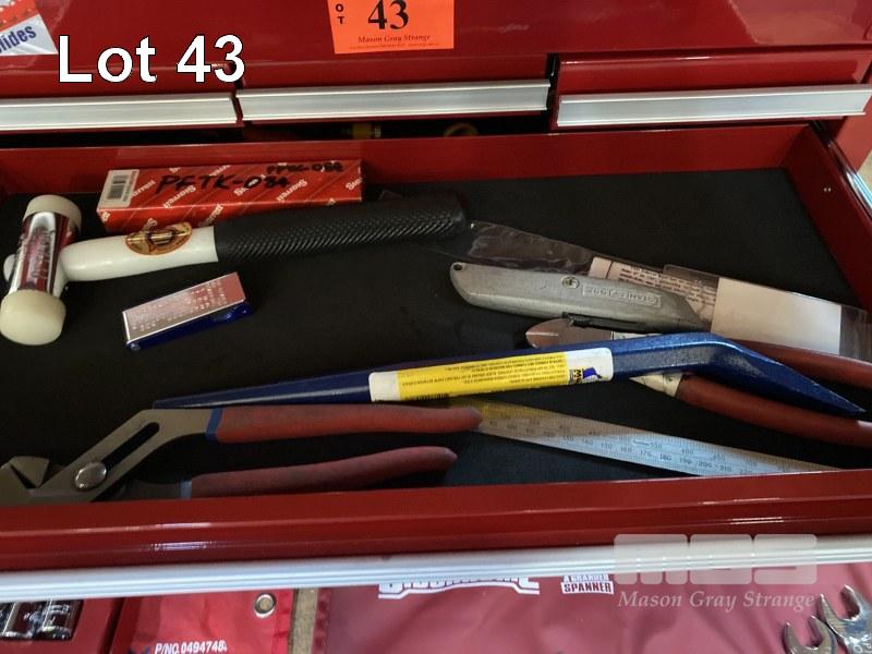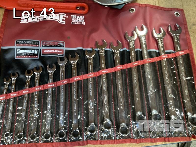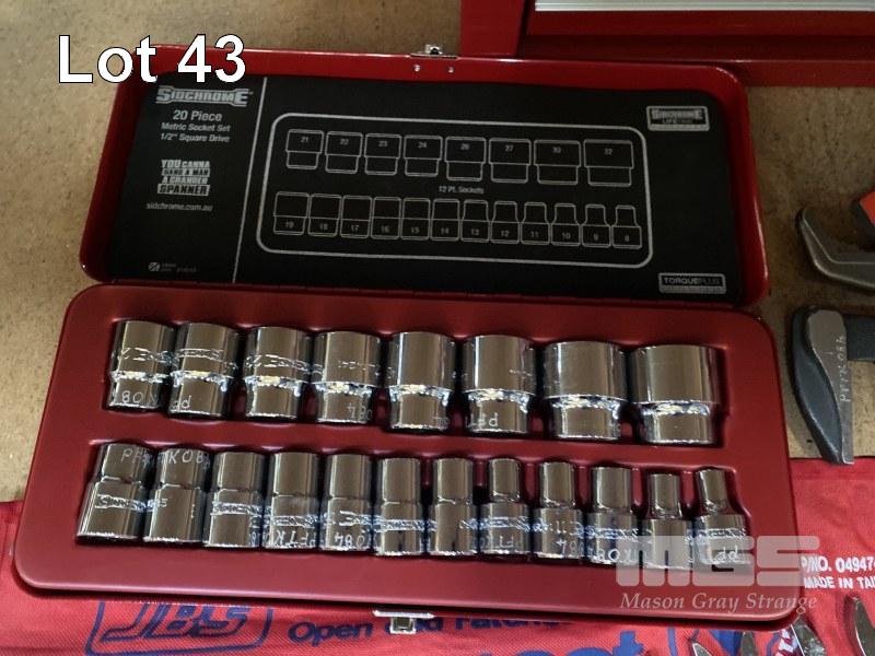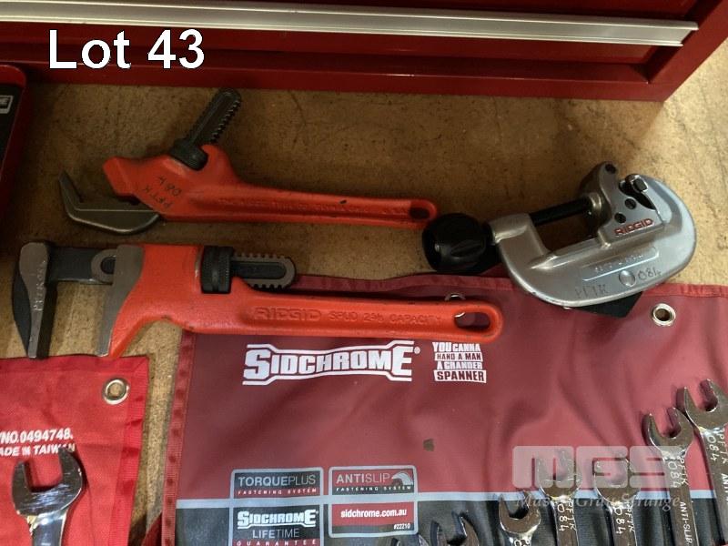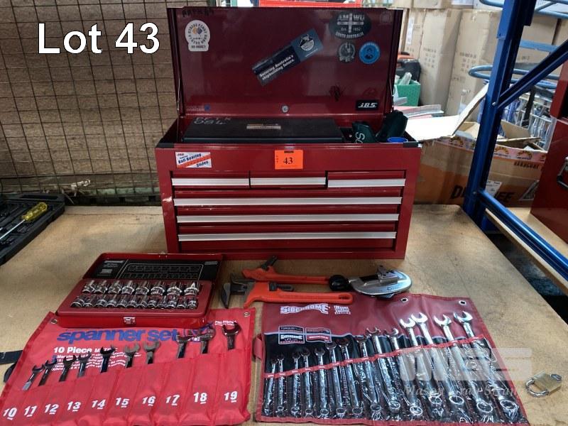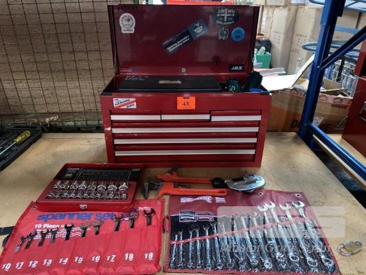6 DRAWER TOOL BOX COMPRISING: SIDCHROME 1/2 INCH SOCKET SET, 8 - 32mm, SIDCHROME SPANNER SET, 6 - 19mm, JBS RATCHET SPANNER SET 10 - 19mm PLUS RIDGID PIPE CUTTER, HEX KEYS, TIN SNIPS, HACK SAW, SDICHRIME RATCHET & SHIFTERS, SCREWDRIVERS ETC.