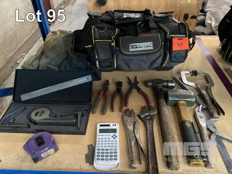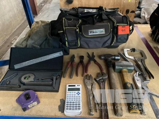 METAL WORKERS TOOLS & CARRY BAG, PLIERS, CUTTERS, HAMMERS, SIDCHROME SHIFTER, TAPE MEASURE, STEEL RULER, CENTER PUNCH, CALCULATOR, MOORE & WRIGHT ADJUSTABLE SQUARE WITH DEGREE WHEEL & LEVEL GAUGE, VISE GRIPS ETC.