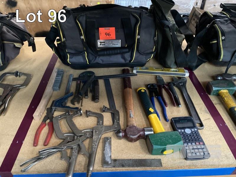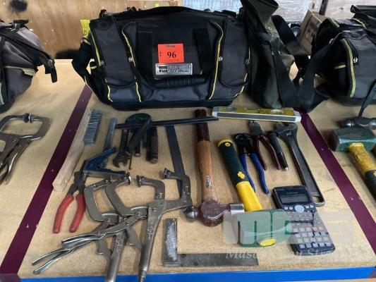 METAL WORKERS TOOLS & CARRY BAG, PLIERS, CUTTERS, HAMMERS, SIDCHROME SHIFTER, WIRE BRISH, CALCULATOR, SPIRIT LEVEL, VISE GRIPS, PUNCHES, MOORE & WRIGHT ADJUSTABLE SQUARE WITH DEGREE WHEEL & LEVEL GAUGE ETC.