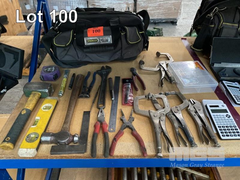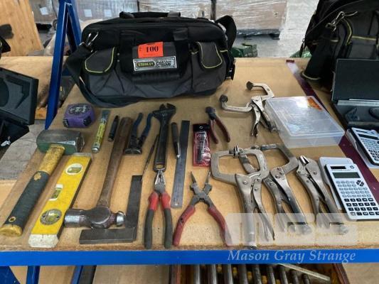 METAL WORKERS TOOLS & CARRY BAG, PLIERS, CUTTERS, HAMMERS, SIDCHROME SHIFTER, STEEL RULERS, CALCULATOR, SPIRIT LEVEL, VISE GRIPS, PUNCHES, METAL SQUARE, SCRIBER ETC.