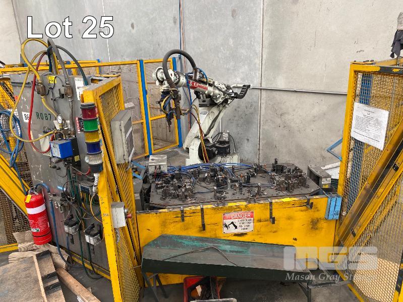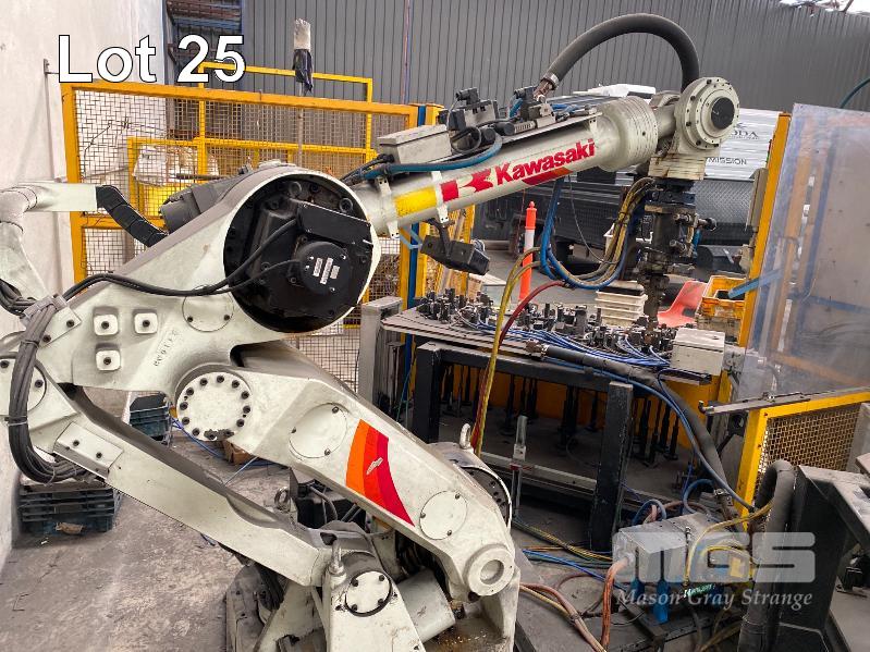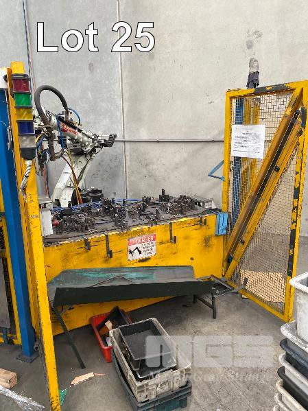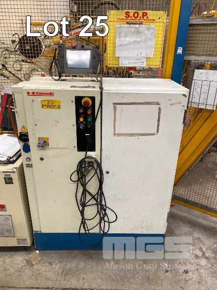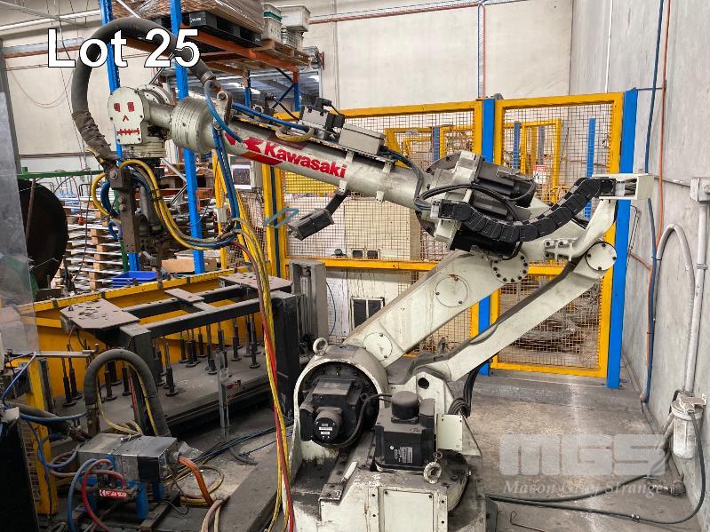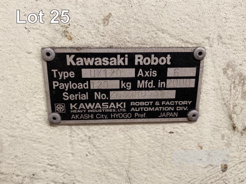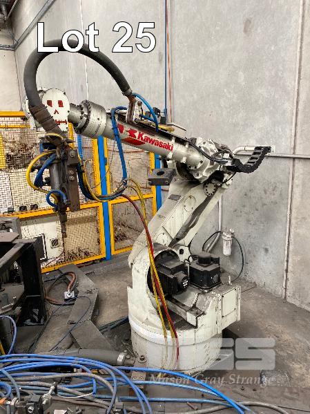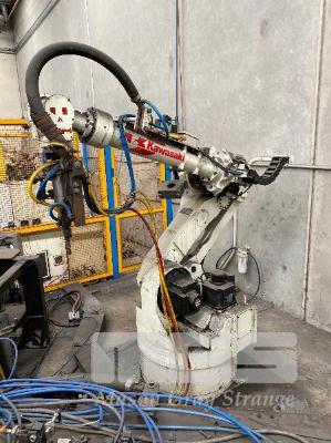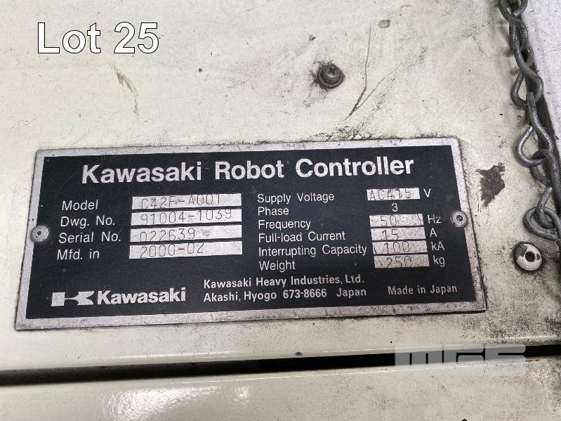 KAWASAKI ROBOTIC WELDING WORK STATION KAWASAKI ROBOT, TYPE: VX120, 6 AXIS ROBOT, SERIAL: 2639R0S3S, DOM: 2000 INCLUDES: 2 x SET UP TABLE IN SAFETY ENCLOSURE, DUAL ACCESS WITH INFARED SAFETY BEAMS, ES FITTED KAWASAKI ROBOT CONTROLLER, MODEL: C42F-A001, DOM:2000, SERIAL: 022639, WITH TEACH PENDANT NASDESCO POWER SUPPLY, MODEL: IWC4-11058