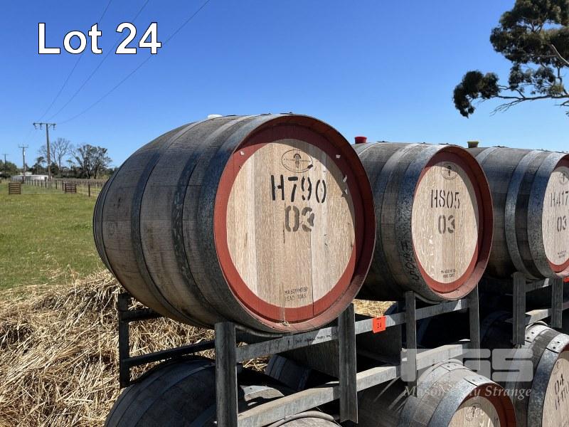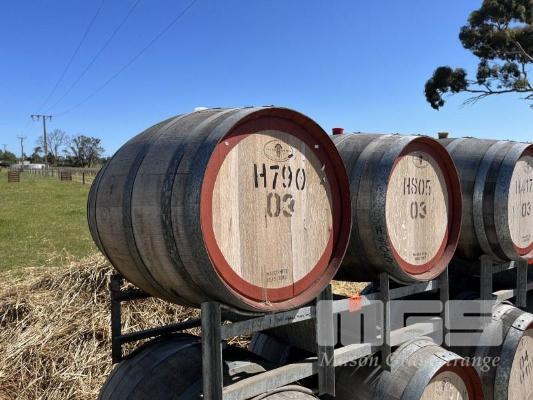 2 x 300L HOGSHEAD WINE BARRELS & GALV STAND, CONTAINING: 2019 ANDREZKE SHIRAZ