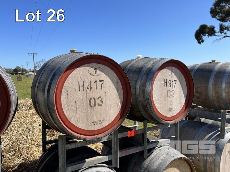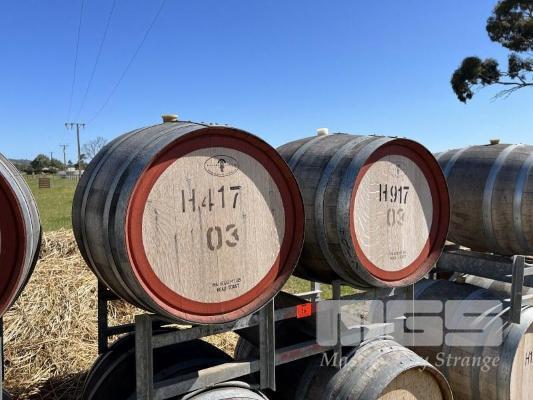 2 x 300L HOGSHEAD WINE BARRELS & GALV STAND, CONTAINING: 2019 CAB SAV ANDREZKE OLD VINE