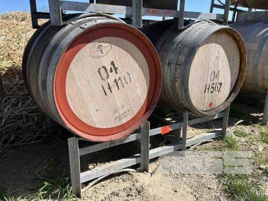 2 x 300L HOGSHEAD WINE BARRELS & GALV STAND, CONTAINING: 2018 BAROSSA SHIRAZ