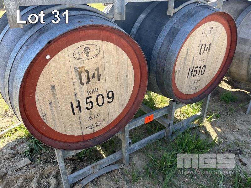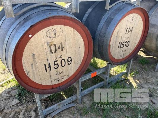 2 x 300L HOGSHEAD WINE BARRELS & GALV STAND, CONTAINING: 2019 BAROSSA SHIRAZ