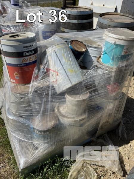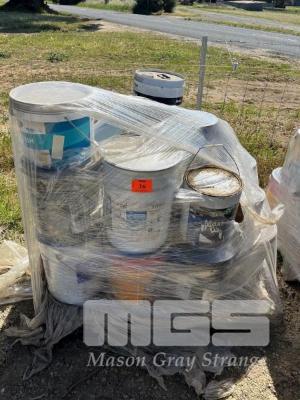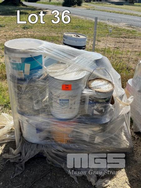 PALLET OF ASSORTED PAINT, LARGE QUANTITY FULL & PARTIAL CANS, WALL PAINT, EPOXY, POLY COAT & SOLVENT ETC.