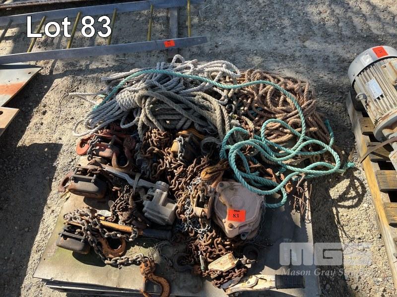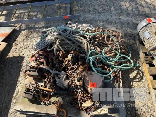 PALLET LOT ASSORTED ROPE, CHAIN BLOCKS, LEVER BLOCKS ETC.