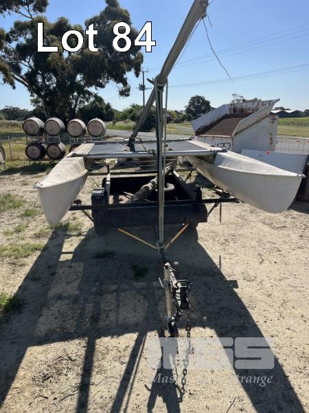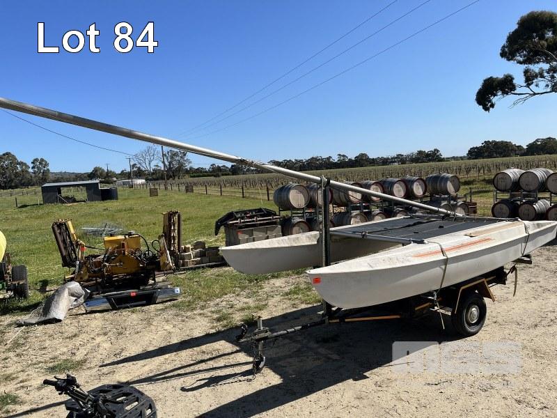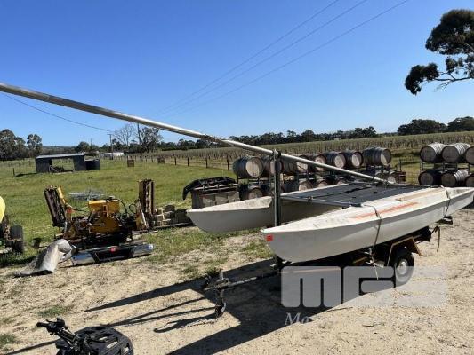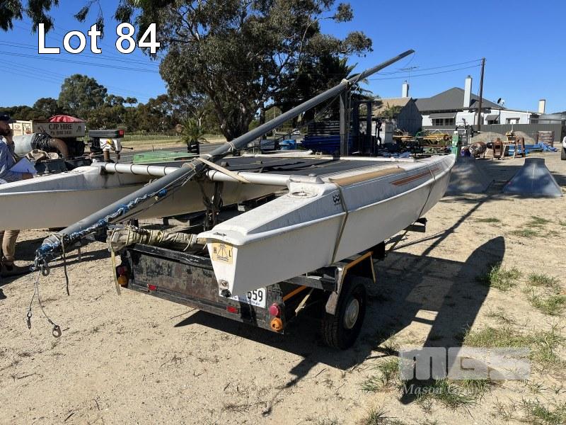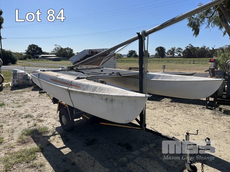 WINDRUSH CATAMARAN, 14ft, WITH TRAILER, SINGLE AXLE, REGO: T0B559, SPARE WHEEL