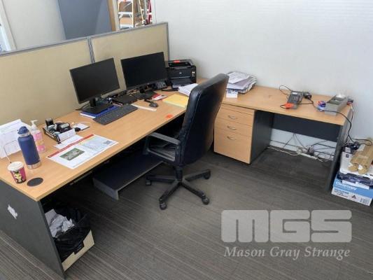 DESK & RETURN, BEECH & STORM TIMBER LAMINATE, 2500 (L) x 2200mm, 3 DRAWER MOBILE, 2 x OFFICE DIVIDERS & BLACK VINYL GAS LIFT CHAIR