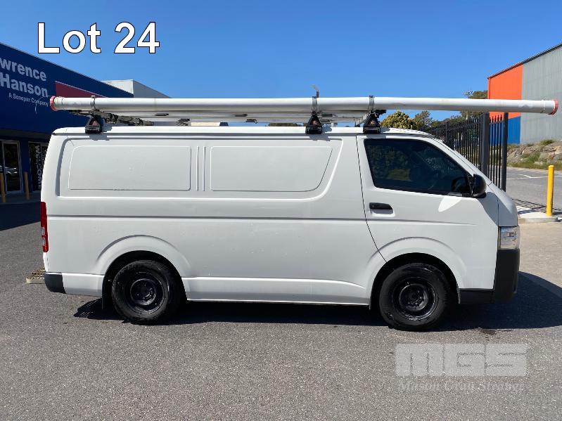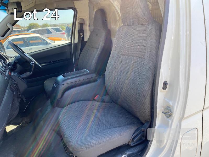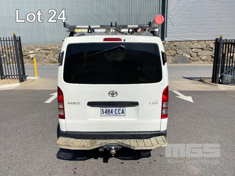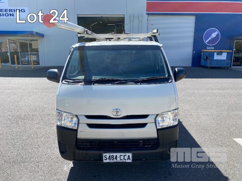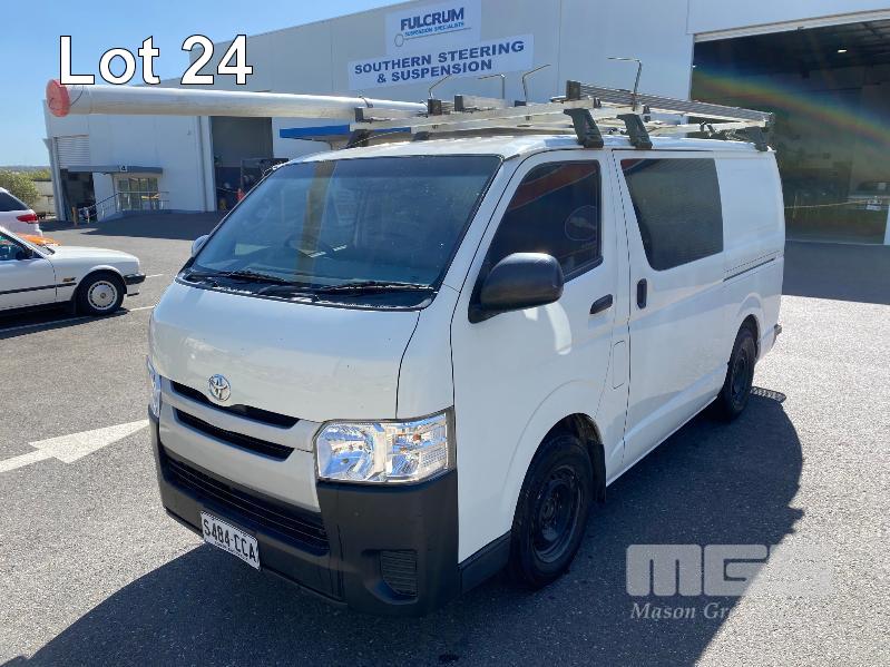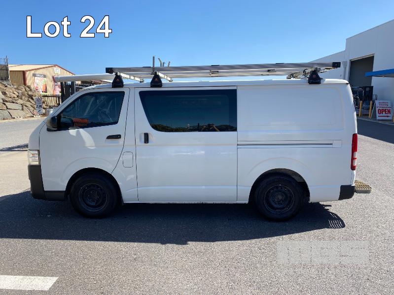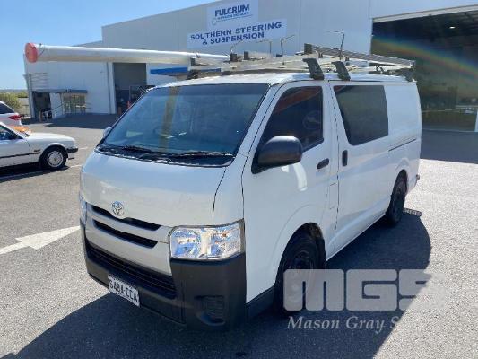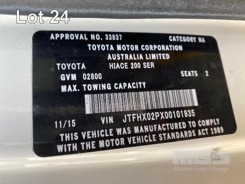 2015 TOYOTA HIACE 200 SER 6.0 LWB VAN RWD REG: S484 CCA (SA) VIN: JTFHX02PX00101935 ODO: 211,982 2.7L, 5 SPEED MANUAL, PETROL, WHITE DUCO, 4 DOORS, 2 SEAT, RWD AIR BAG, AIR CON, CD PLAYER, CENTRAL LOCKING, POWER WINDOWS, TOYOTA ROOF RACKS WITH LADDER RACK, 2 x TACTIX SLIDE OUT TOOL BOXES WITH KEYS, STORAGE SHELVES, REVERSE CAMERA , TOW BALL, REAR STEP, GVM: 2800kg,MINOR DENT RHS REAR BAR (NO PAPERS, WITH 1 KEY/S, WITH OWNER'S MANUAL, WITH SERVICE BOOKS)
