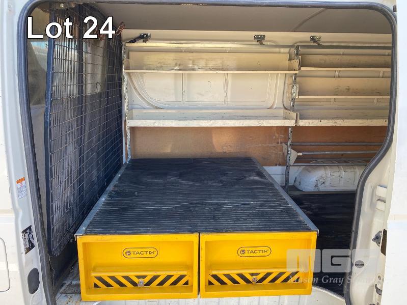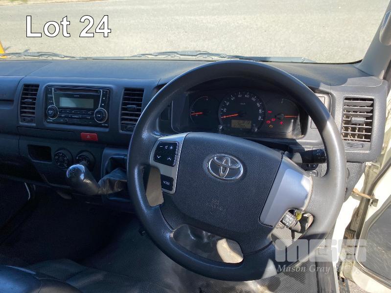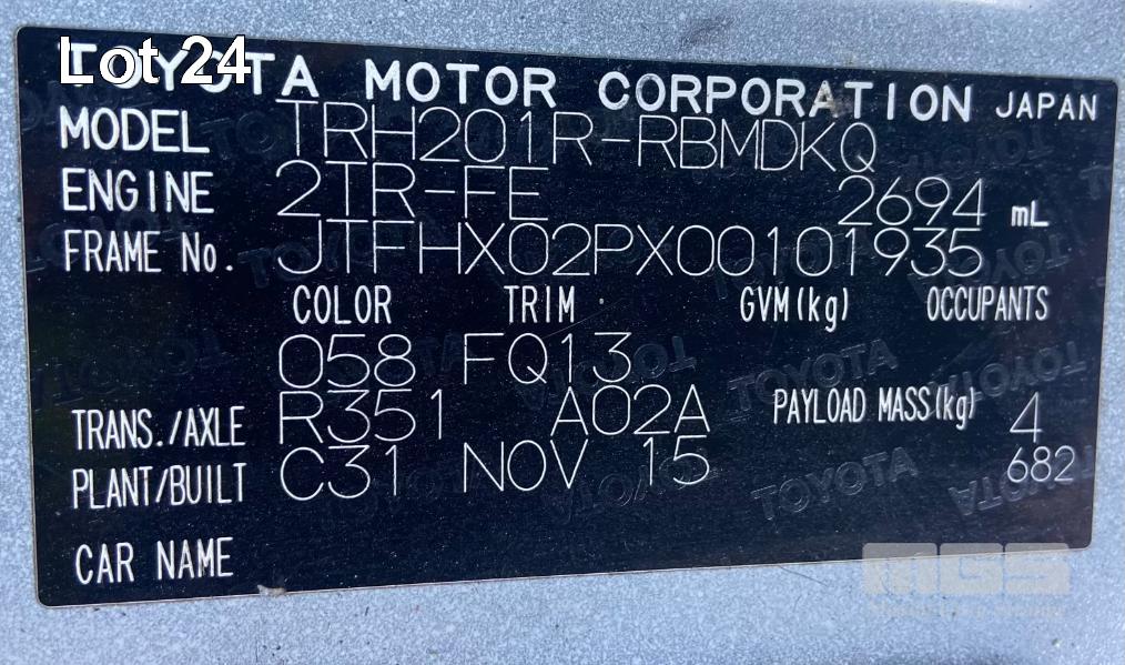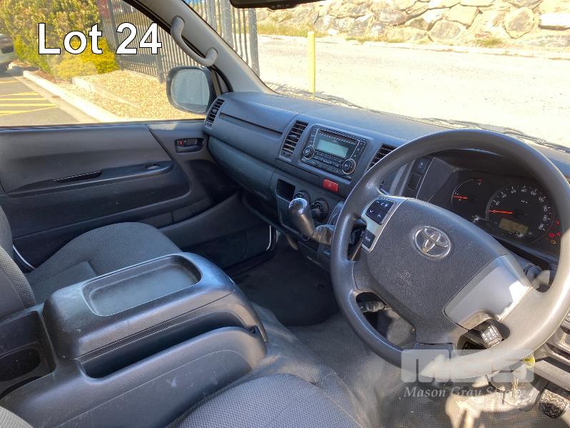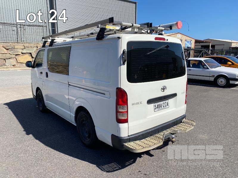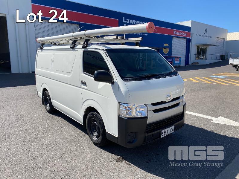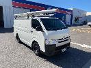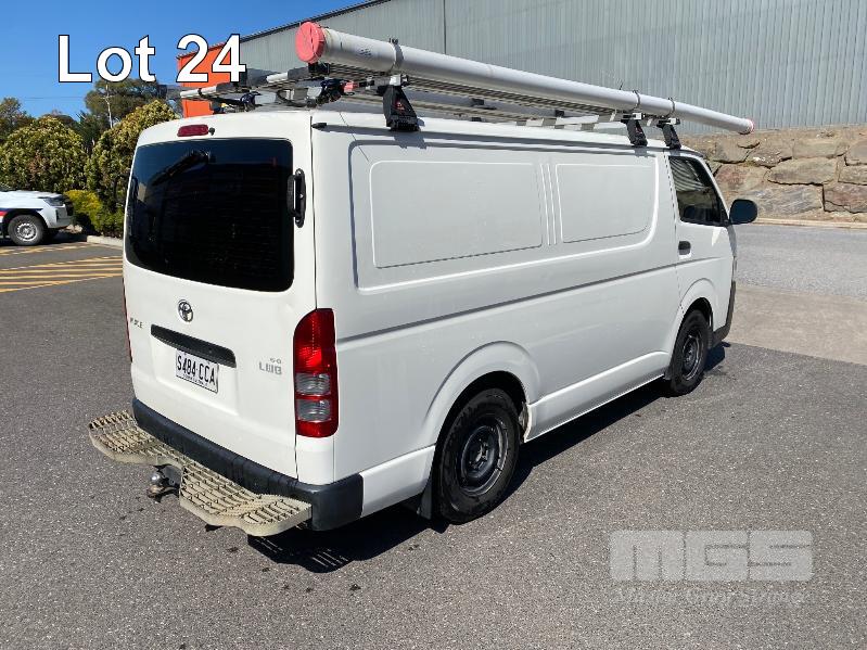 2015 TOYOTA HIACE 200 SER 6.0 LWB VAN RWD REG: S484 CCA (SA) VIN: JTFHX02PX00101935 ODO: 211,982 2.7L, 5 SPEED MANUAL, PETROL, WHITE DUCO, 4 DOORS, 2 SEAT, RWD AIR BAG, AIR CON, CD PLAYER, CENTRAL LOCKING, POWER WINDOWS, TOYOTA ROOF RACKS WITH LADDER RACK, 2 x TACTIX SLIDE OUT TOOL BOXES WITH KEYS, STORAGE SHELVES, REVERSE CAMERA , TOW BALL, REAR STEP, GVM: 2800kg,MINOR DENT RHS REAR BAR (NO PAPERS, WITH 1 KEY/S, WITH OWNER'S MANUAL, WITH SERVICE BOOKS)