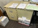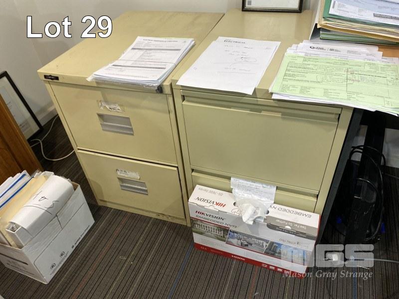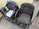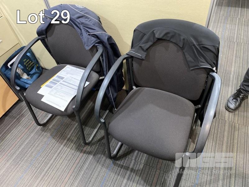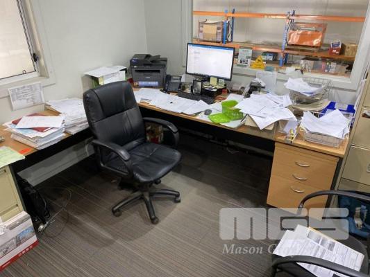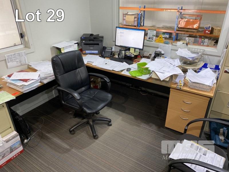 TIMBER LAMINATE DESK & RETURN, 2400 x 2400m, BLACK EXEC CHAIR, 2 x BLACK VISITORS CHAIRS, 2 x 2 DRAWER FILING CABINETS