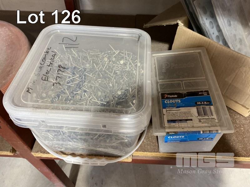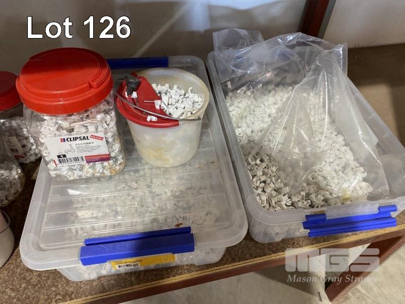 ASSORTED CABLE CLIPS & LARGE TUB OF CLOUTS.