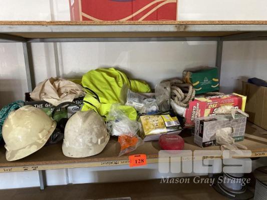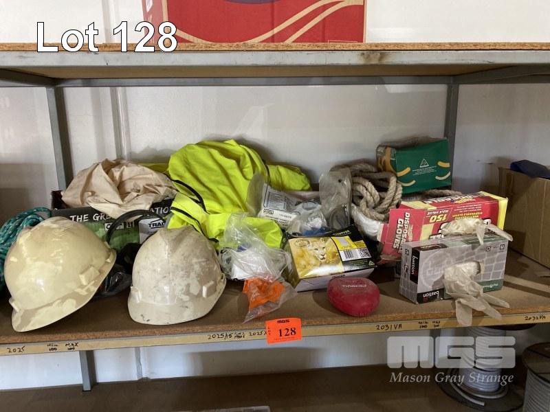 ASSORTED PPS GEAR, HELMETS, EAR PLUGS, SAFETY GLASSES, DUST MASKS, RATCHET STRAPS & ROPE & FALL ARRESTORS