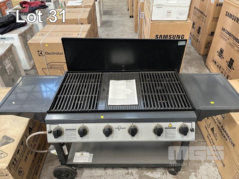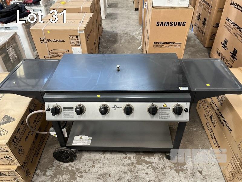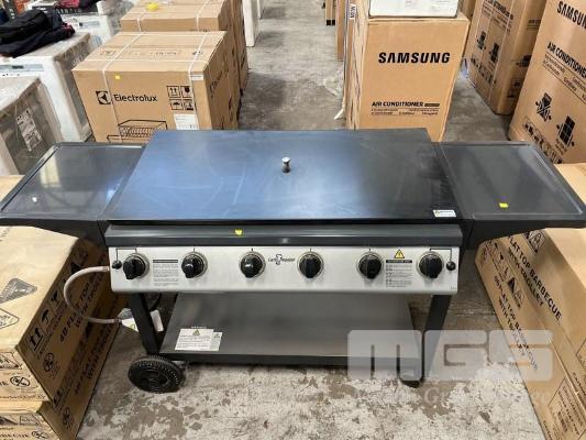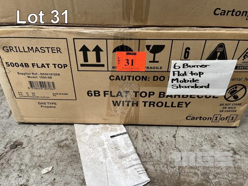 GRILLMASTER 6 BURNER FLAT TOP BBQ, ON MOBILE TROLLEY MODEL: 1000-6B NEW IN BOX (1 BOX) ORP: $799