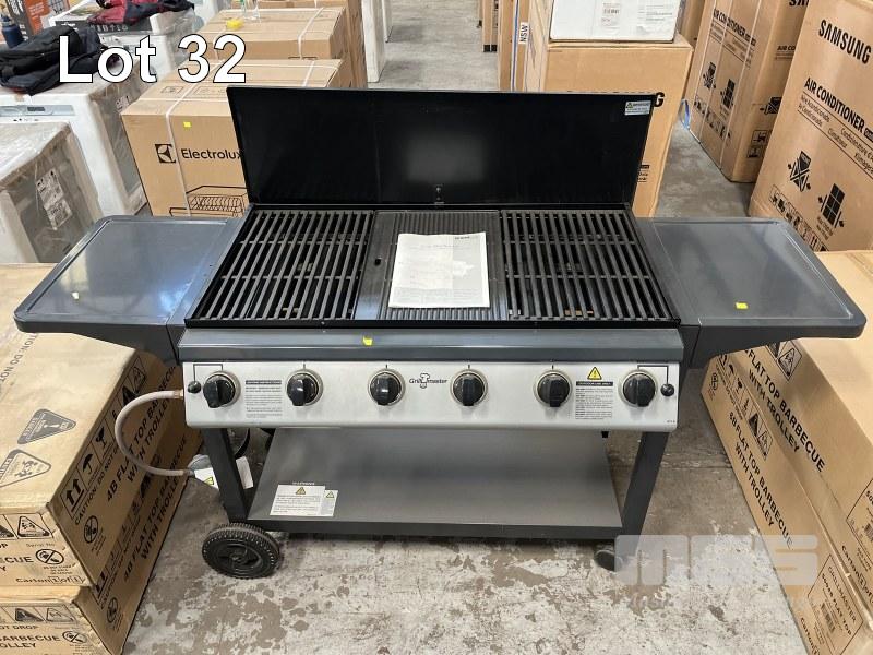 GRILLMASTER 6 BURNER FLAT TOP BBQ, ON MOBILE TROLLEY MODEL: 1000-6B NEW IN BOX (1 BOX) ORP: $799