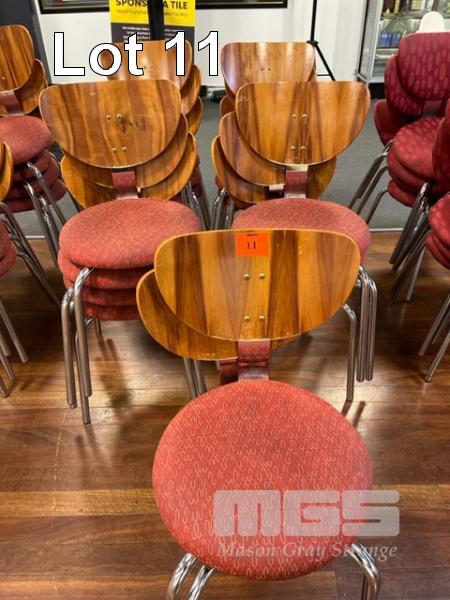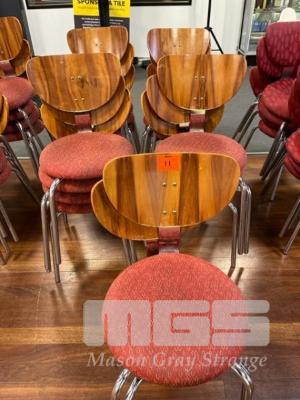 18 x RED CLOTH RESTAURANT CHAIRS, CURVED TIMBER BACK, CHROME LEGS, STACKABLE