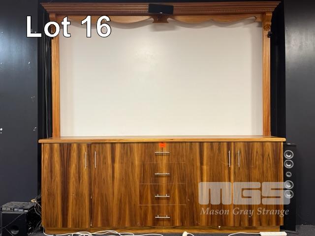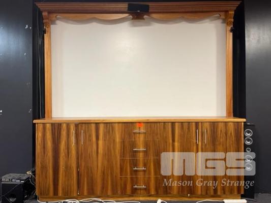 BROADVIEW FOOTBALL CLUB TIMBER PROJECTOR SCREEN, 2700 x 450 x 2650mm (H), 4 DRAWER, 4 DOOR, (BUYER TO REMOVE)