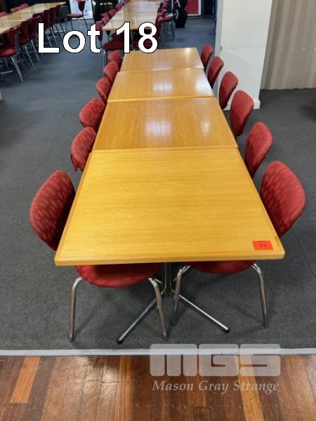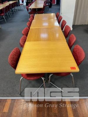 4 x TIMBER TOP TABLES, 850 x 850mm, CHROME BASES, WITH 12 x RED CLOTH CHAIRS, CHROME LEGS