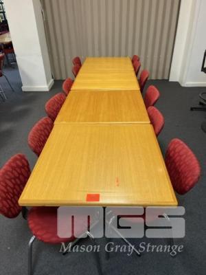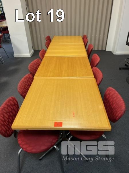 4 x TIMBER TOP TABLES, 850 x 850mm, CHROME BASES, WITH 12 x RED CLOTH CHAIRS, CHROME LEGS