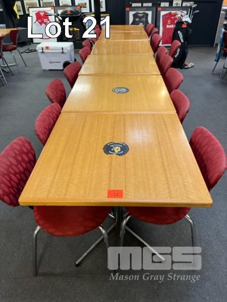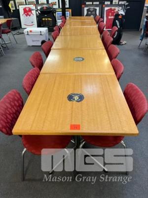 6 x TIMBER TOP TABLES, 850 x 850mm, CHROME BASES, WITH 18 x RED CLOTH CHAIRS, CHROME LEGS