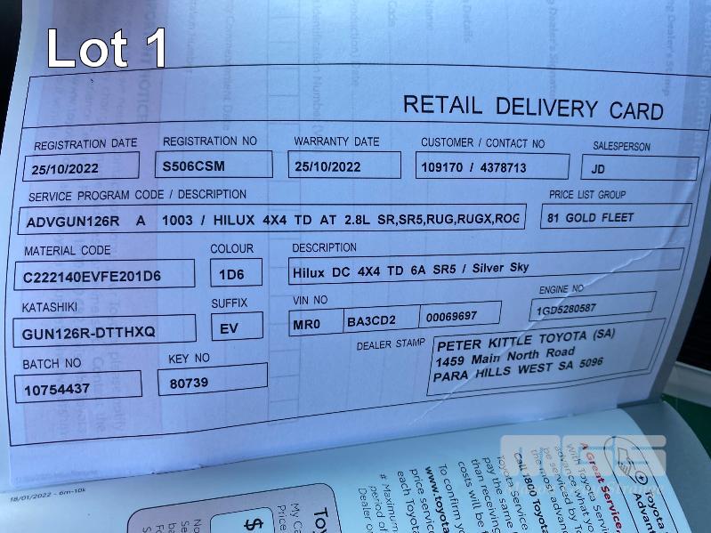 2021 TOYOTA HILUX SR5, GUN126R-DTTHXQ, DUAL CAB UTILITY 4x4 REG: S506 CSM (SA) VIN: MR0BA3CD200069697 ENG: 1GD5280587 ODO: 31,246kms SHOWING 2.8 LITRE TURBO DIESEL, AUTOMATIC TRANSMISSION, SILVER DUCO, 4 DOORS, 5 SEAT, 4x4 ABS, AIR BAG, AIR CON, ALLOY WHEELS, BLUETOOTH, CENTRAL LOCKING, CRUISE CONTROL, IMMOBILISER, POWER STEERING, POWER WINDOWS, SIDE STEP, SPARE WHEEL, TONNEAU COVER, TOW BAR, TRACTION CONTROL, ALLOY ROLL BAR KEY #11 (WITH 2 KEY/S, WITH OWNER'S MANUAL, WITH SERVICE BOOKS) CONDITION: REAR/L/H/S PANEL & BUMPER - DENTS & SCRATCHES FRONT/L/H/S GUARD - DENTS & SCRATCHES