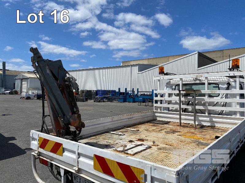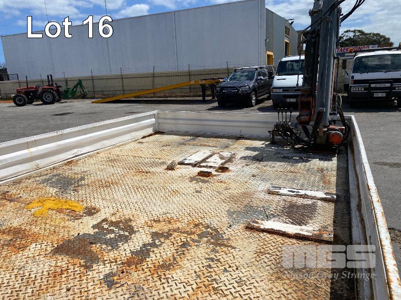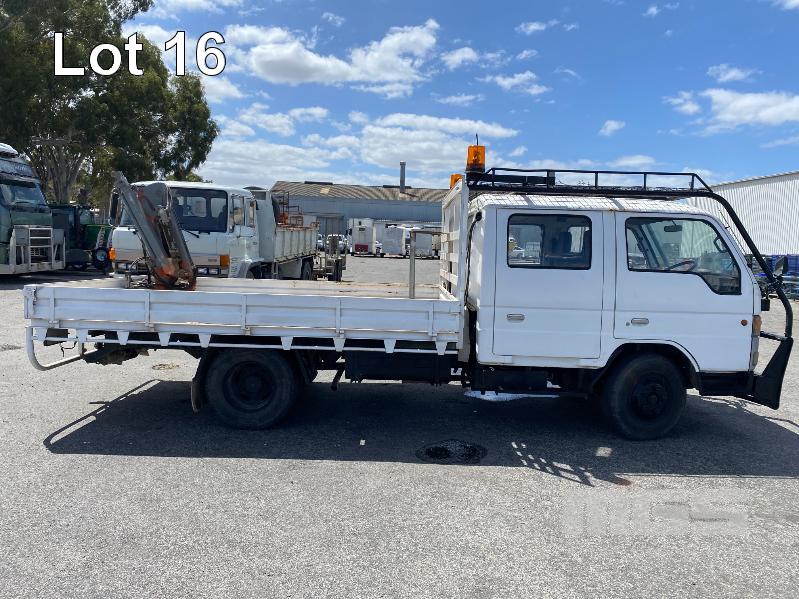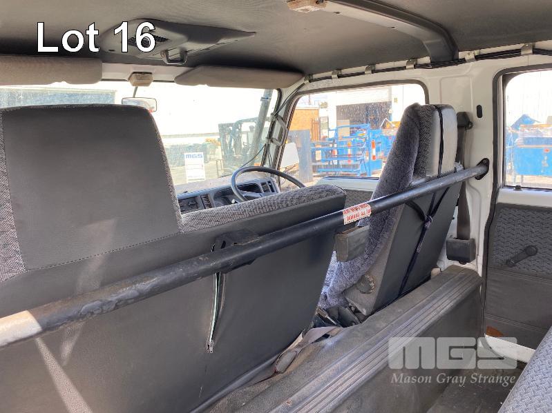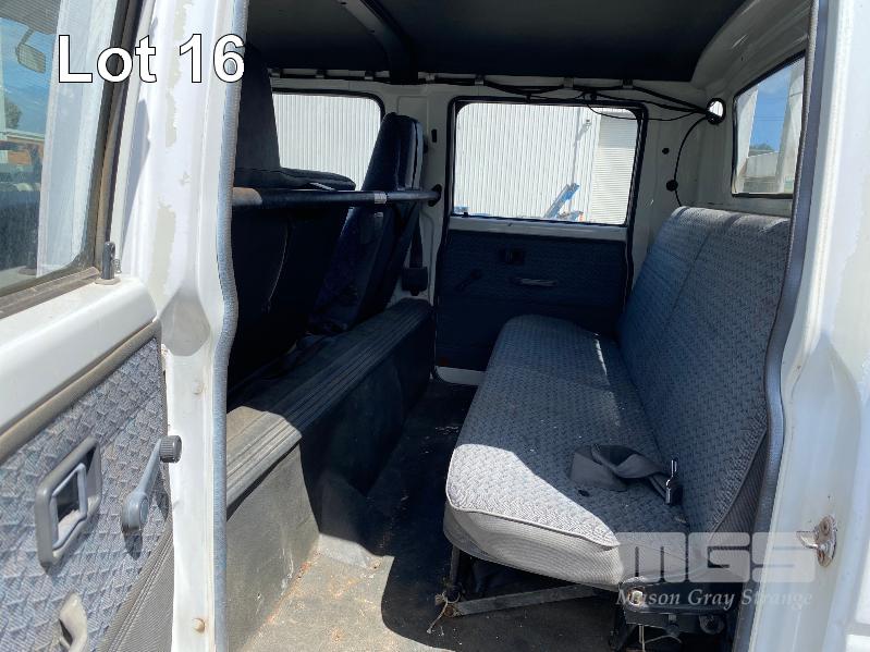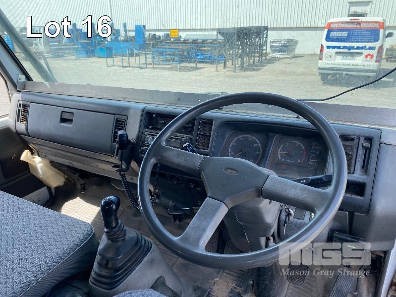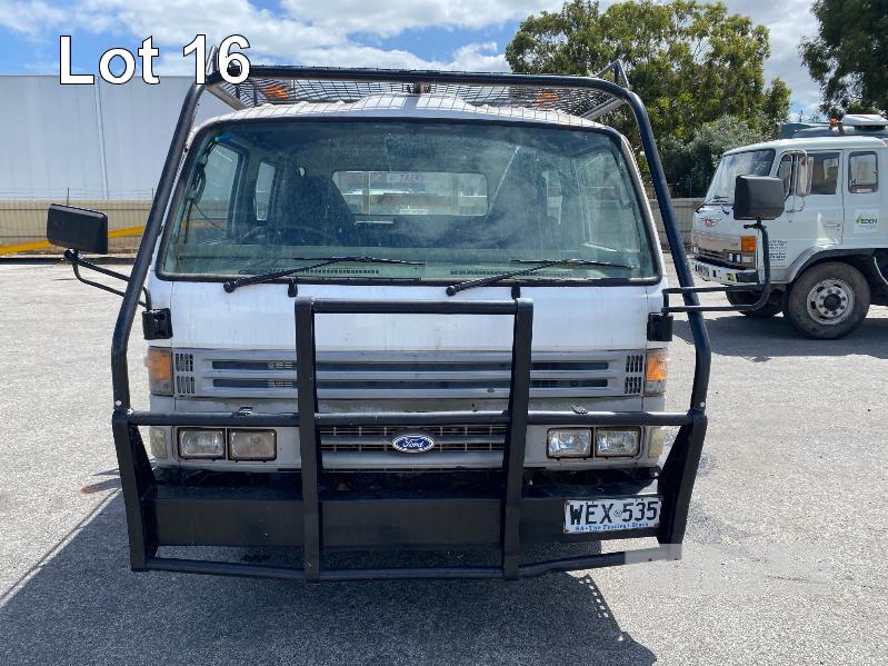 1998 FORD WG54 4x2 CREW CAB TRAYTOP TRUCK REG: WEX 535 (SA) VIN: JC0AAASGDVWM70356 ODO: 76,250kms SHOWING 4.0 LITRE DIESEL, 5 SPEED MANUAL TRANSMISSION, SPRING SUSPENSION, WHITE DUCO, 4 DOORS, 6 SEAT, AIR CON, CD PLAYER, CB RADIO, BULL BAR, STEEL TRAY, TOW BALL HITCH REAR MOUNT HIAB CRANE HINGED SIDE STEEL TRAY, 3500 x 2250mm OVERHEAD CAGED CARRY RACK WITH HAZARD LIGHTS KEY #42 (WITH 1 KEY/S)