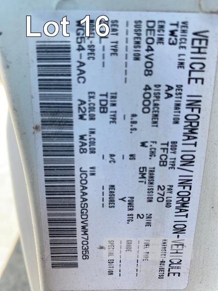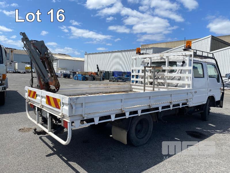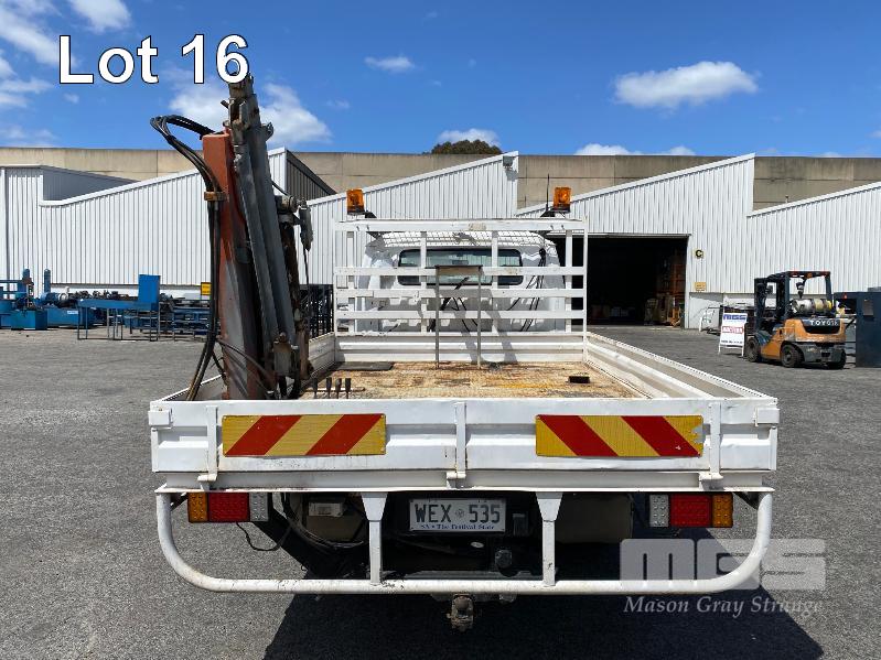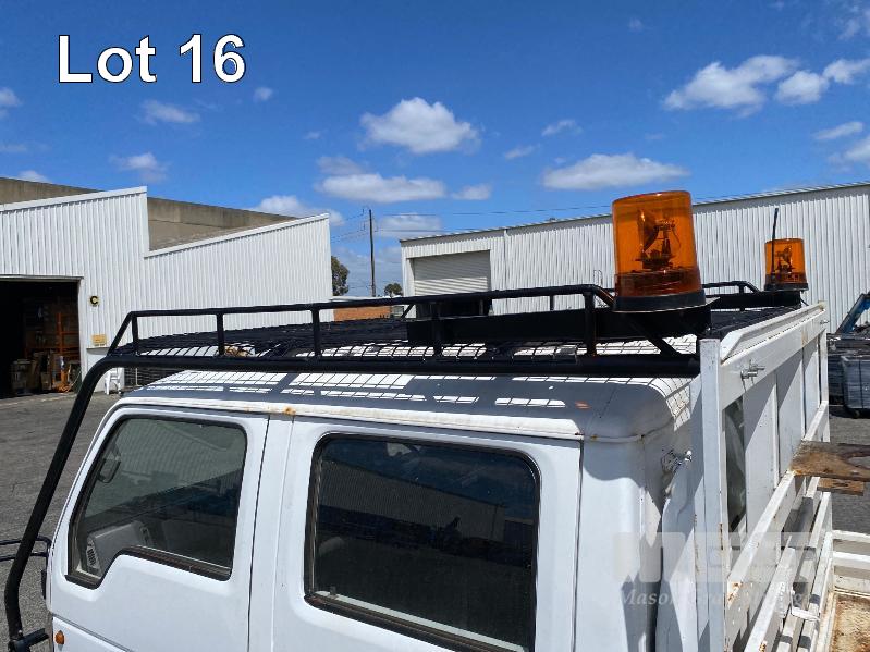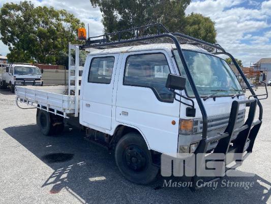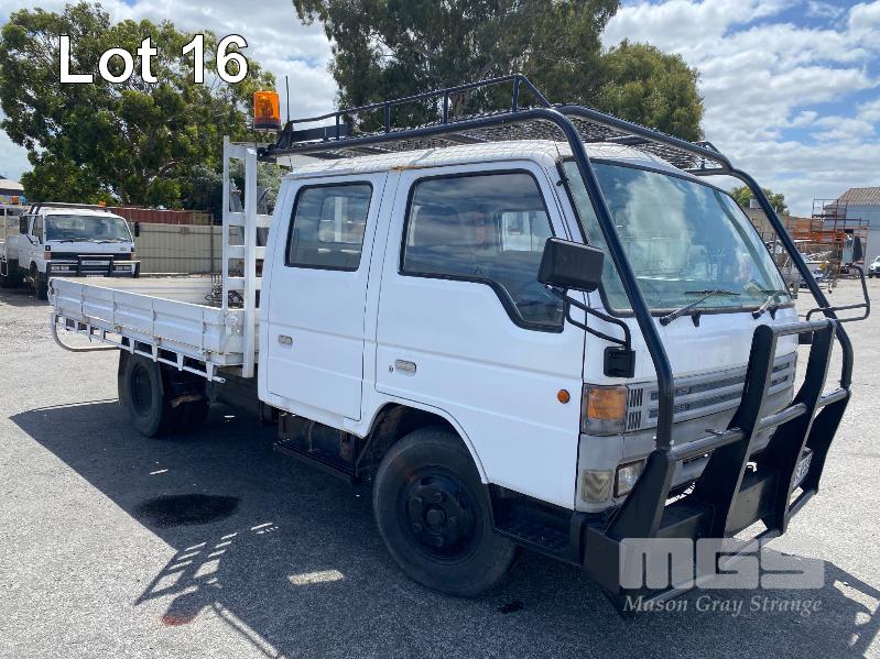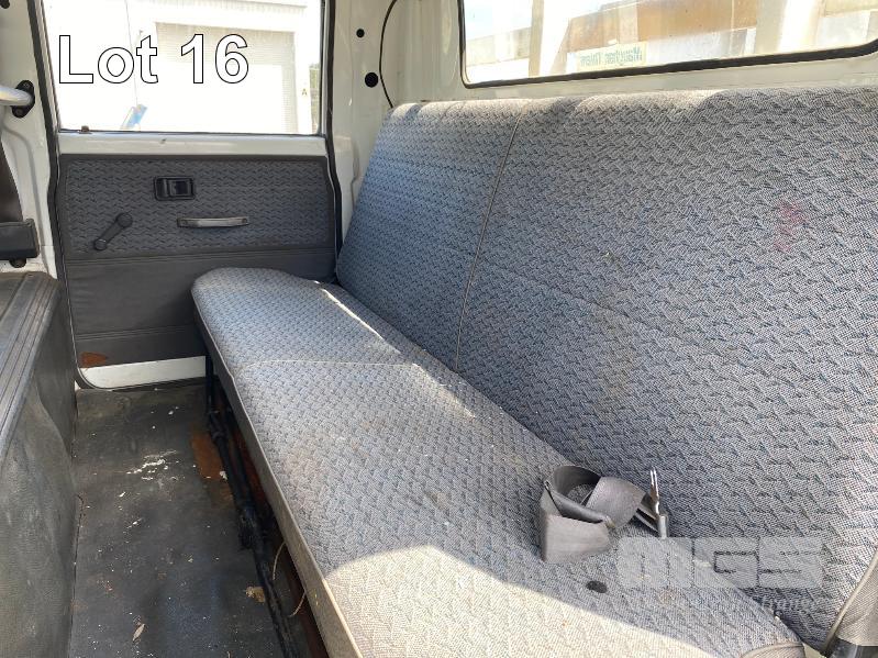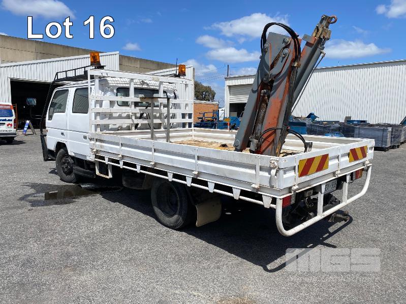 1998 FORD WG54 4x2 CREW CAB TRAYTOP TRUCK REG: WEX 535 (SA) VIN: JC0AAASGDVWM70356 ODO: 76,250kms SHOWING 4.0 LITRE DIESEL, 5 SPEED MANUAL TRANSMISSION, SPRING SUSPENSION, WHITE DUCO, 4 DOORS, 6 SEAT, AIR CON, CD PLAYER, CB RADIO, BULL BAR, STEEL TRAY, TOW BALL HITCH REAR MOUNT HIAB CRANE HINGED SIDE STEEL TRAY, 3500 x 2250mm OVERHEAD CAGED CARRY RACK WITH HAZARD LIGHTS KEY #42 (WITH 1 KEY/S)