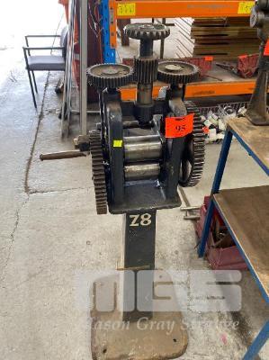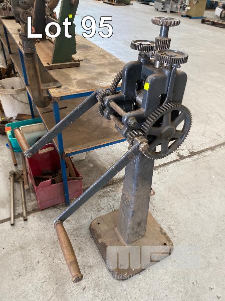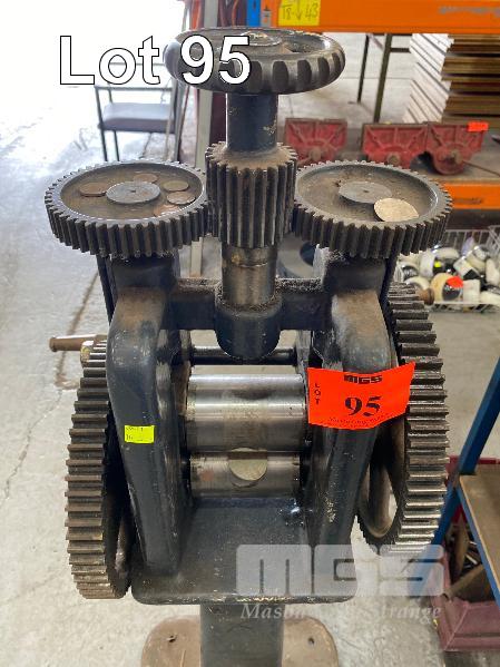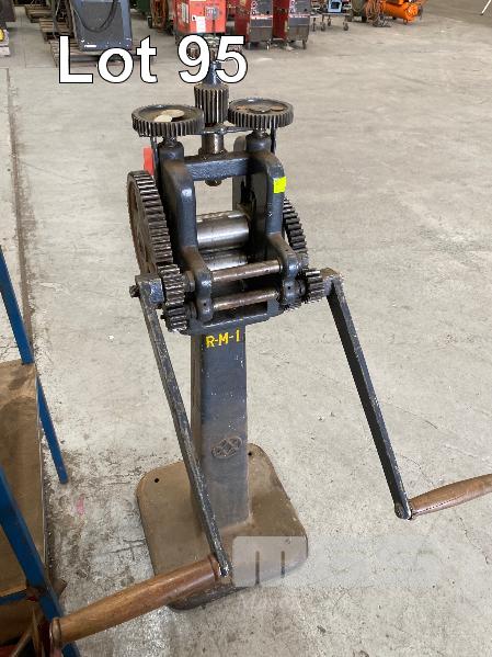 VINTAGE METAL ROLLING MILL, MANUAL 4" ROLLERS, ADJUSTABLE THICKNESS UP TO 2" TWIN MANUAL CRANKS