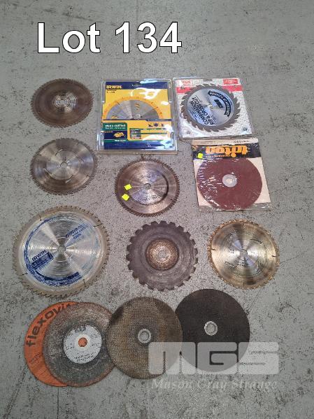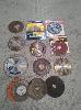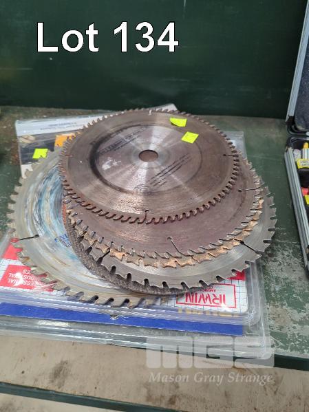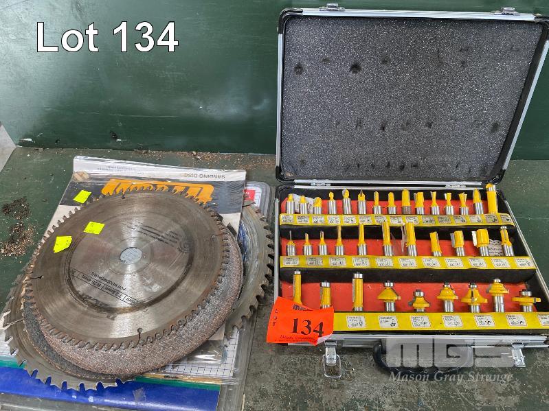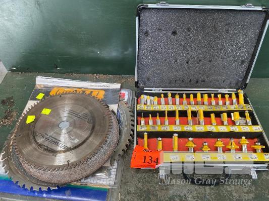 ASSORTED BENCH SAW BLADES, CUT-OFF DISCS AND SANDING DISC & SET OF ROUTER BITS IN CARRY CASE