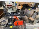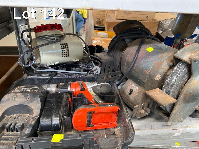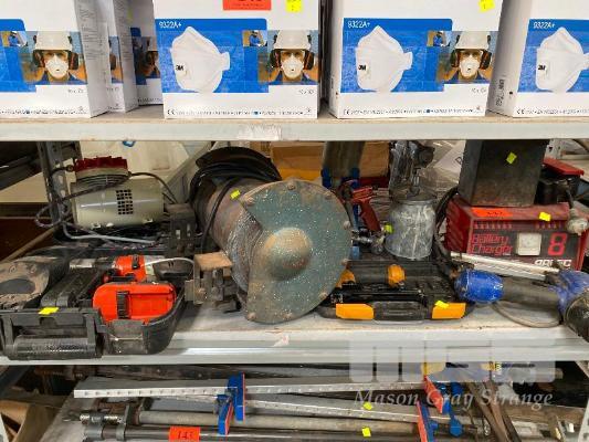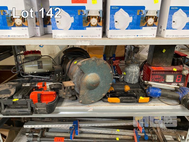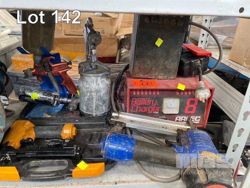 ASSORTED PNEUMATIC & ELECTRICAL, INCLUDES SPRAY GUNS, COMPRESSOR, NAIL GUNS, ARLEC 8 BATTERY CHARGER, VINTAGE TRANSFORMER ETC, WEBSTER 8" BENCH GRINDER & BLACK & DECKER CORDLESS DRILL (MODEL HP188F3-XE) (1 x SHELF)