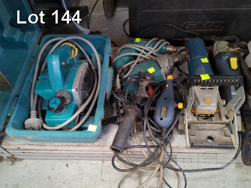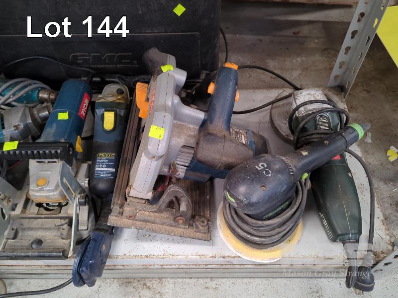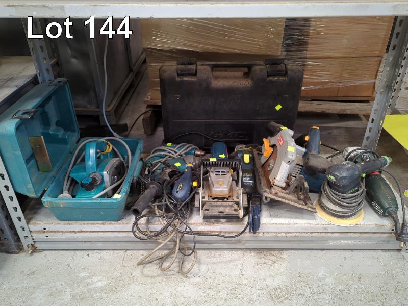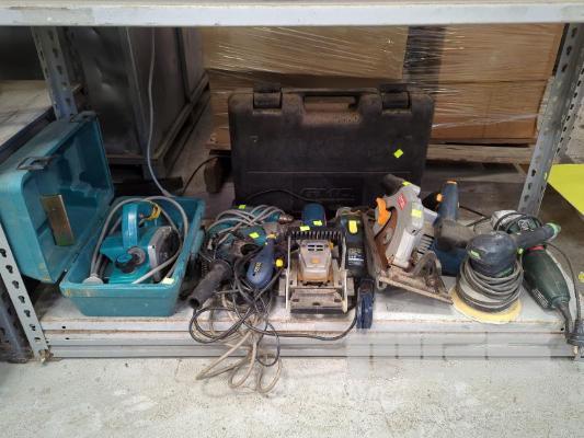ASSORTED POWER TOOLS, 240V INCLUDING MAKITA PLANNER, RYOBI BISCIT CUTTER & CIRCULAR SAW, DRILLS, 2 X GMC ANGLE GRINDERS, ORBITAL SANDER, ETC (CONTENTS SHELF).