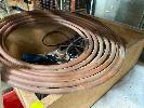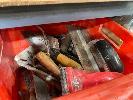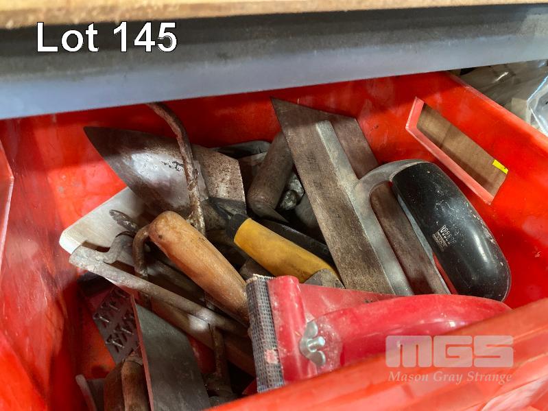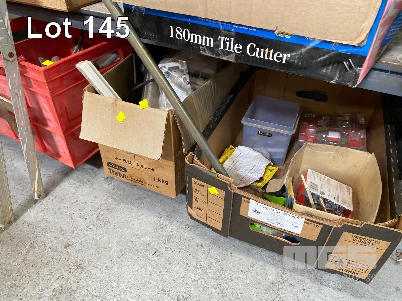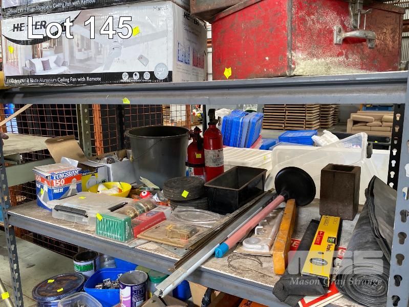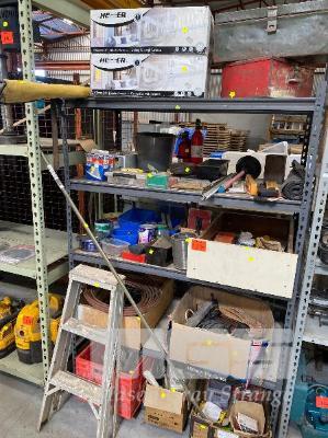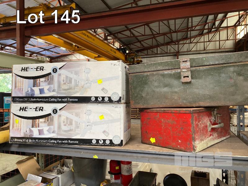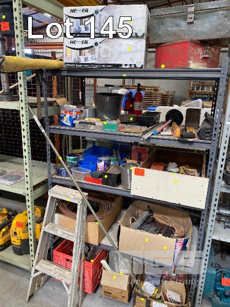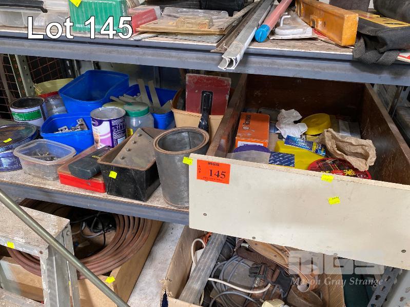 ASSORTED WORKSHOP ITEMS ETC. INCLUDES FIXINGS, FASTENERS, HINGES, COPPER PIPE, ELECTRICAL, FISHING, LEVELS, STEEL RULES, TROWELS, EMPTY TOOL BOXES, 2 x HELLER "MARCUS" 1200MM CEILING FANS WITH REMOTES (NEW IN BOX), STEP LADDER AND MORE (CONTENTS 5 X SHELVES)