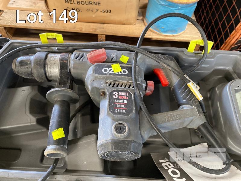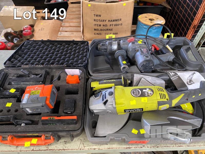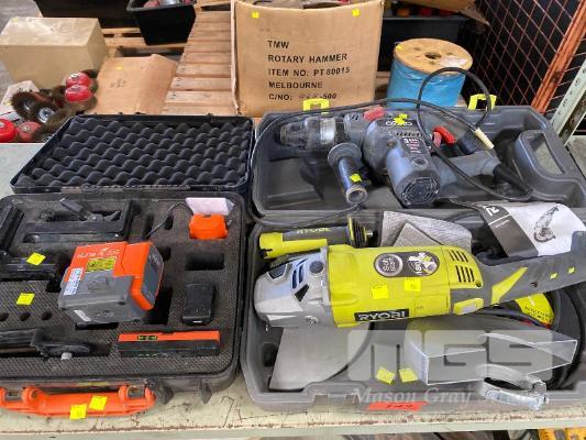 OZITO HAMMER DRILL, RYOBI ANGLE GRINDER, 230mm & ALINE AL-30G LASER LEVEL