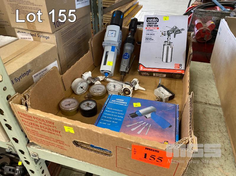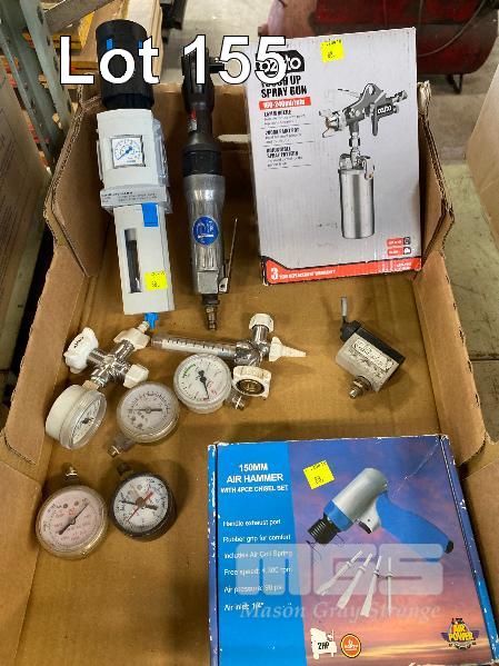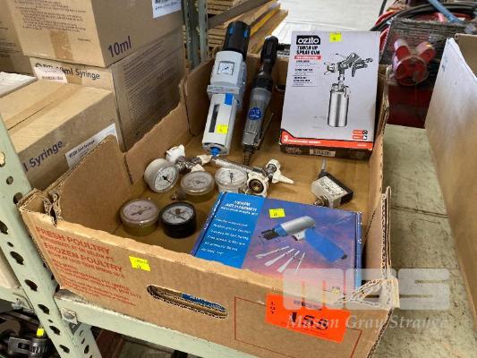 1 x TRAY ASSORTED AIR GAUGES, REGULATOR, SPRAY GUN, AIR CHISEL SET & 1/2" AIR RATCHET DRIVER