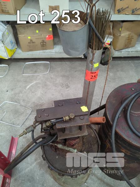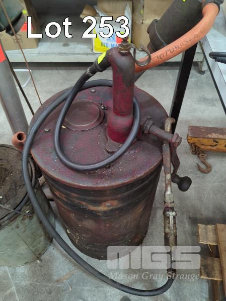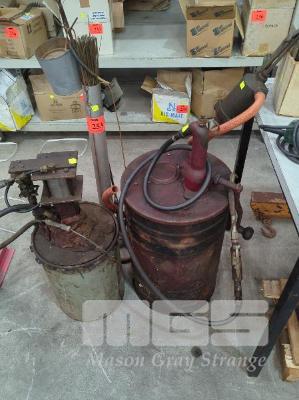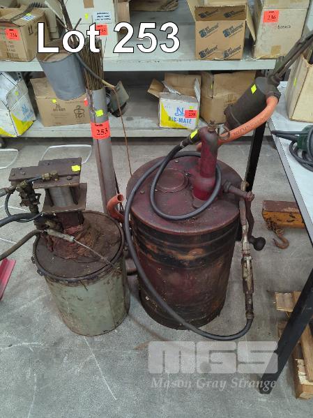 PNEUMATIC GREASE DRUM PUMP & 20 LITRE DRUM, 2 x MANUAL DRUM PUMPS & 40 LITRE OIL DRUM, BRAZING RODS & HOLDER
