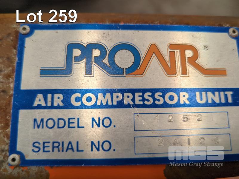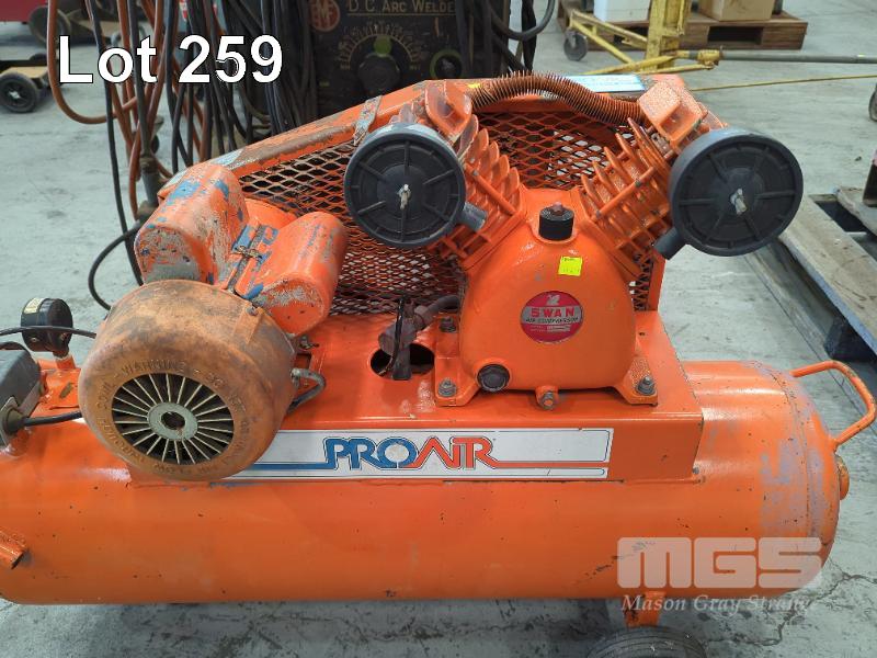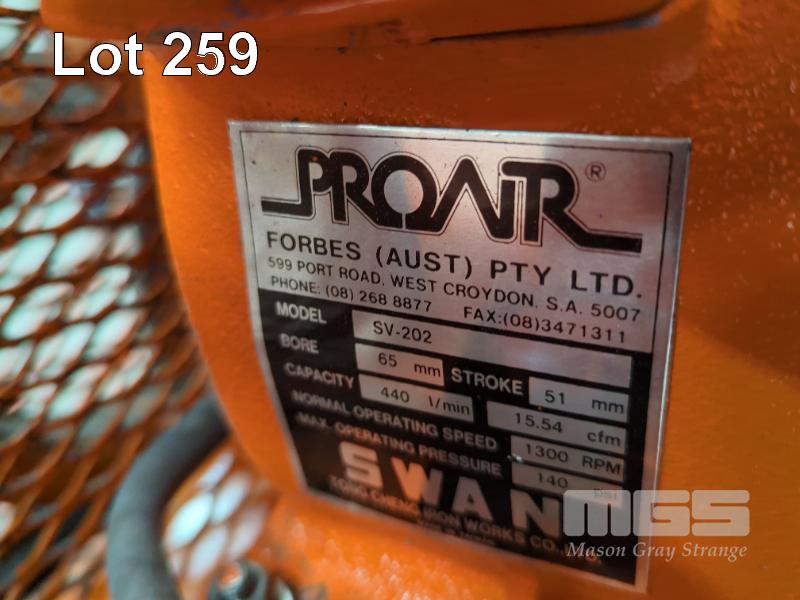 PROAIR PORTABLE AIR COMPRESSOR. MODEL 12521. TWIN CYLINDER SWAN COMPRESSOR UNIT. 440L/MIN. 140 PSI. 15.5 CFM. 240V.
