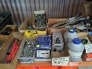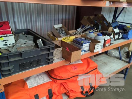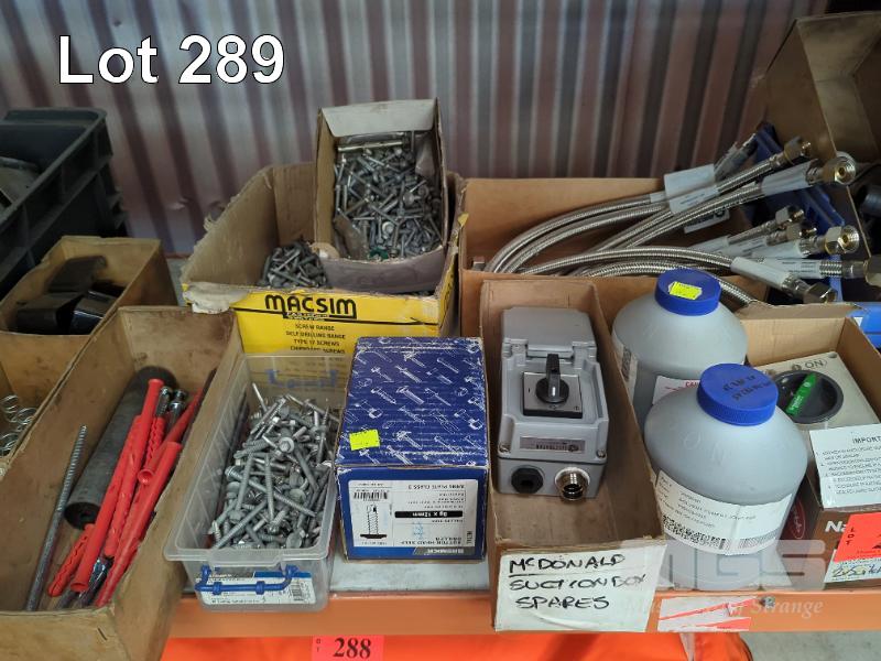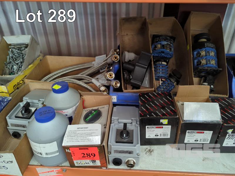 ASSORTED ELECTRICAL SWITCHES, INCLUDING 3 POLE GPO'S, MULTI STAGE BARREL SWITCHES, STAINLESS STEEL BRADED HOSES, HINGES, NUTS & BOLTS, FASTNERS, ETC. 1 x SHELF
