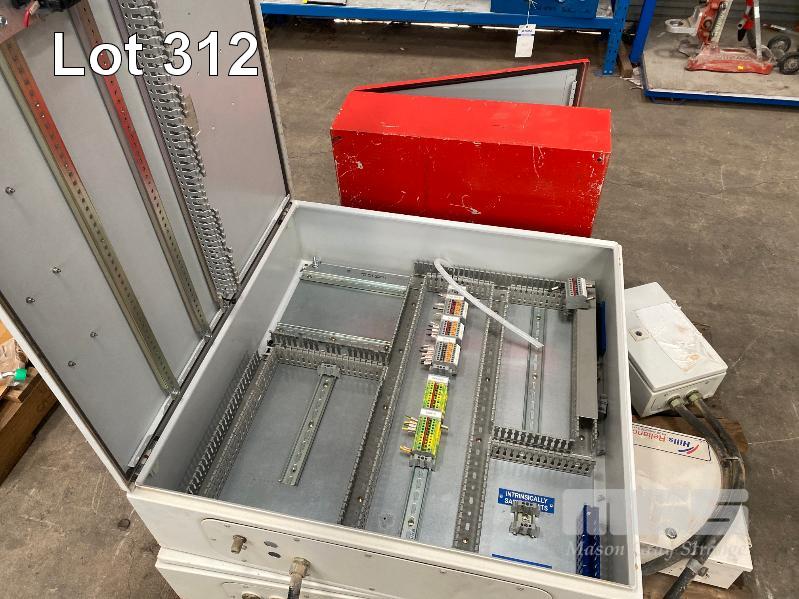 5 x ELECTRICAL CONTROL CABINETS, STEEL FITTED WITH ASSORTED ELECTRICAL SWITCHES, PARTS, ETC SIZES INCLUDE 760 x 760 x 220mm, 600 x 600 x 300mm 1 x PALLET