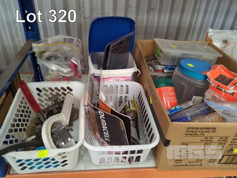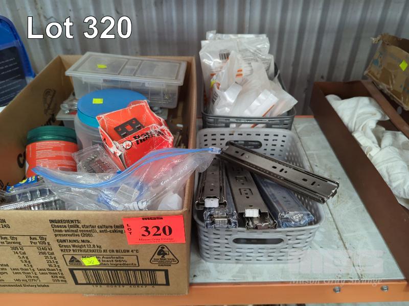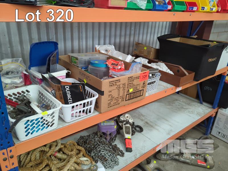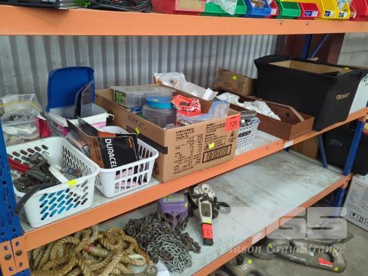 CHAINS, WIRE ROPE, PUSH BIKE PARTS & TYRE REPAIR KITS, BATTERIES, HARDWARE, SLIDERS, NUTS, BOLTS, ETC 1 x SHELF