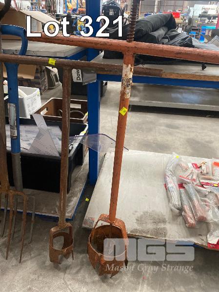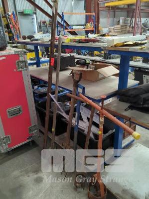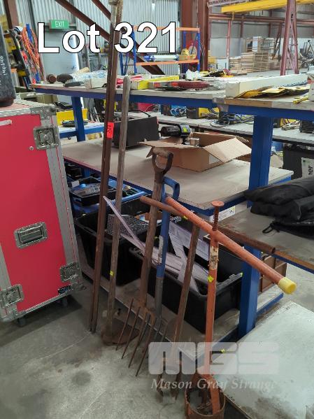 ASSORTED GARDEN TOOLS, 2 x POST HOLE DIGGERS, 2 x BREAKER BARS, 2 x PITCH FORKS & HOE
