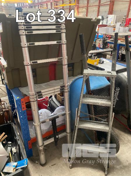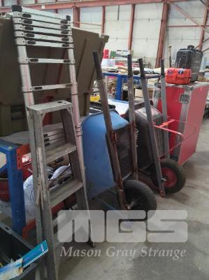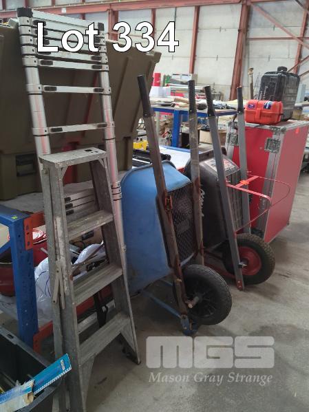 2 x BUILDERS WHEELBARROWS, 1 x POLY & 1 x STEEL TUB, (STEEL TUB MISSING FEET), 2 x LADDERS, ALLOY EXTENDABLE & GALSV STEP LADDER, 4'