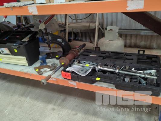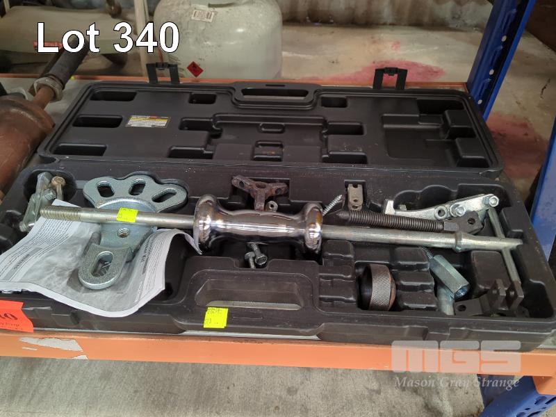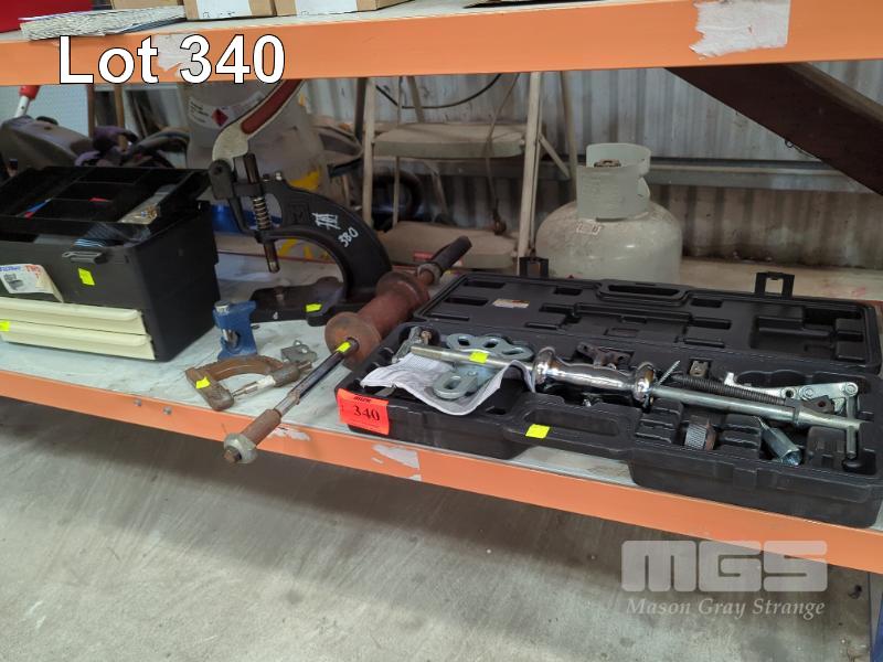 SLIDE HAMMER KIT WITH BEARING, GEAR & DENT PULLING ATTACHMENTS, PITTSBURGH WITH LARGE SLIDE HAMMER, 700mm, STUD PRESS MC, SPRING LEVER TYPE & 3 x SMALL HAMMER & SCREW STUD PRESSES, TOOL BOX WITH STUDS & TOOLING