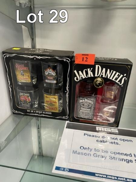 TWO JACK DANIEL'S "OLD No.7 BRAND" GIFT PACKS. 1 @ PACK CONTAINING SET OF 4 JACK DANIEL'S SPIRIT GLASSES. 1 @ PACK CONTAINING 1 X BOTTLE JACK DANIEL'S OLD TIME "OLD No. 7 BRAND" SOUR MASH WHISKY, 350ML AND 2 X JACK DANIEL'S QUALITY TENNESSEE WHISKY SPIRIT GLASSES.