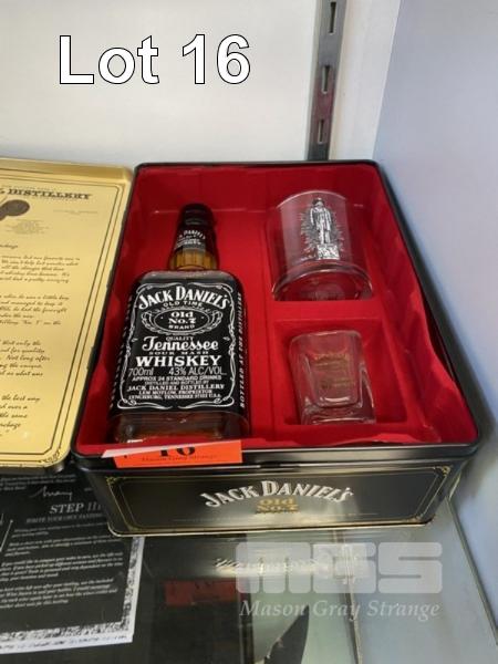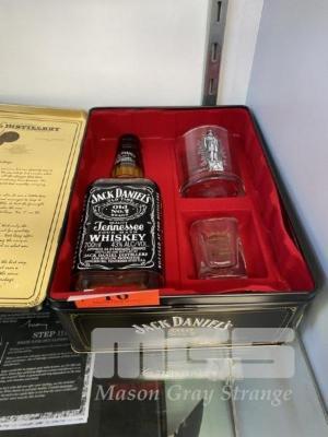 JACK DANIEL'S "OLD No.7 BRAND" PRESSED TIN GIFT PACK CONTAINING 1 X BOTTLE JACK DANIEL'S OLD TIME "OLD No. 7 BRAND" QUALITY TENNESSEE SOUR MASH WHISKY, 700ML AND 1 X JACK DANIEL'S TENNESSEE WHISKY SPIRIT GLASSE (ONE GLASS MISSING).