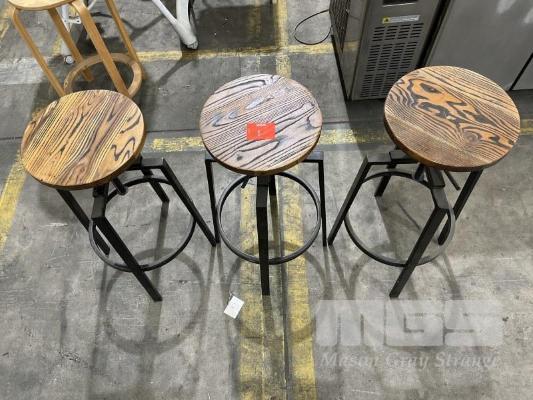 3 x BAR STOOLS, TIMBER SEAT WITH BLACK LEGS, HEIGHT ADJUSTABLE