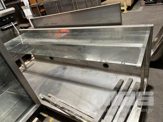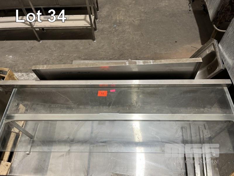 STAINLESS STEEL BENCH WITH GLASS DISPLAY SHELF 1870 (L) x 750mm (D) & SPLASHBACK 600mm (H) PLUS STAINLESS STEEL WALL MOUNT LEGS