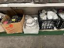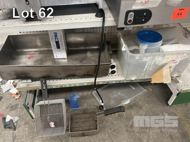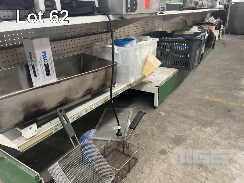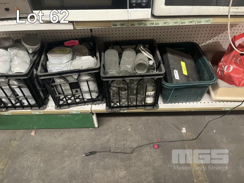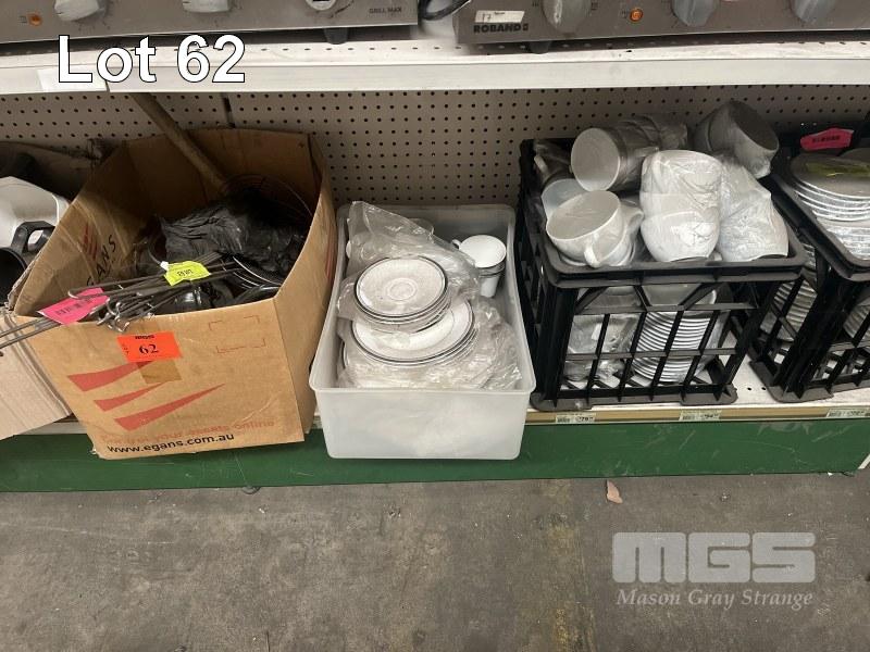 ASSORTED PLATES, CUPS, SAUCERS, GLASSWARE, JUGS, STAINLESS STEEL KITCHEN ACCESSORIES, CHIP BASKETS STAINLESS STEEL TRAYS, CONTENTS OF LOWER SHELF