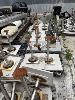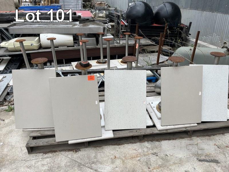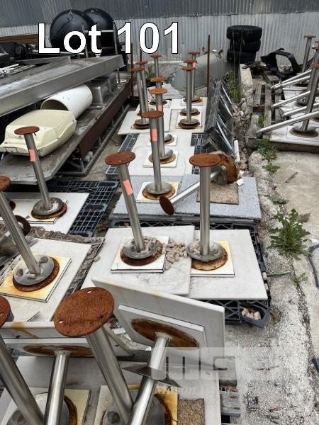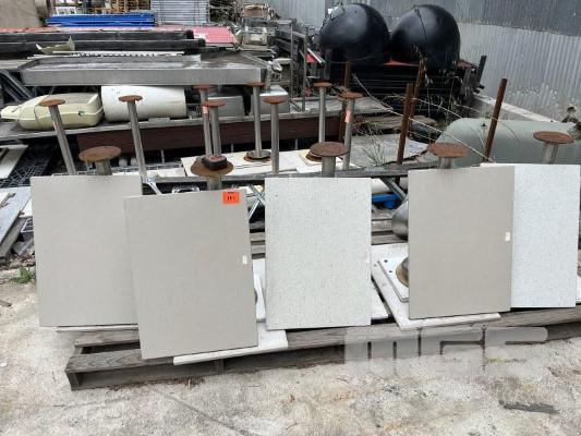 32 x VERY USED CAFE TABLES, PEDESTALS REUSABLE, SOME TOPS OK